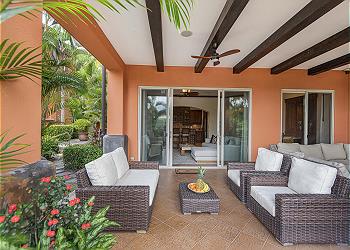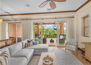 Subtle hues harmonize with deep, luxurious dark wood, while refined furnishings and meticulous detailing contribute to an ambiance of relaxed, opulent tropical living. The master suite provides seclusion, featuring access to a small private balcony. A second bedroom echoes the master's elegance and connects to a third bedroom. The communal area flows seamlessly, from the kitchen to the dining and living spaces, with expansive floor-to-ceiling sliding glass doors that reveal the hallmark covered terrace, emblematic of tropical living.